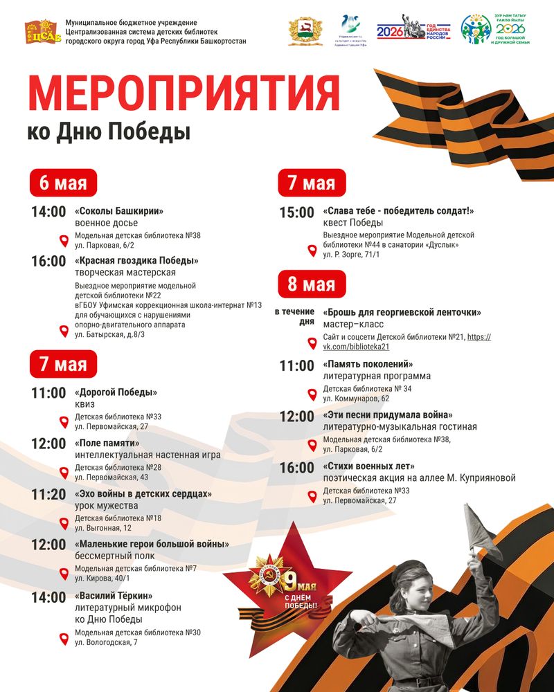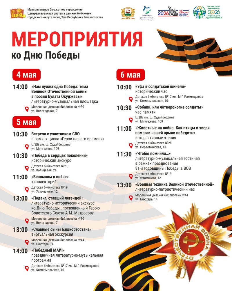В предпраздничные майские дни детские библиотеки города приглашают читателей принять участие в мероприятиях, посвященных 81-ой годовщине Победы в Великой Отечественной войне 1941-1945 гг. Традиционно в библиотеках пройдут акции «Георгиевская ленточка», «Окна Победы». Состоятся патриотические игры и викторины, уроки памяти и флешмобы. Все подробности ссылка